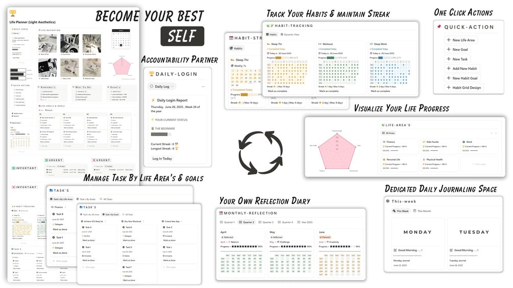 - Habit + task + goal system = real momentum