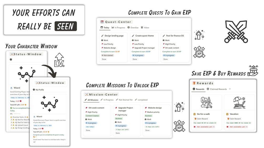Yes! You’ll complete weekly quests and missions to earn XP, level up, and redeem rewards — all inside Notion.